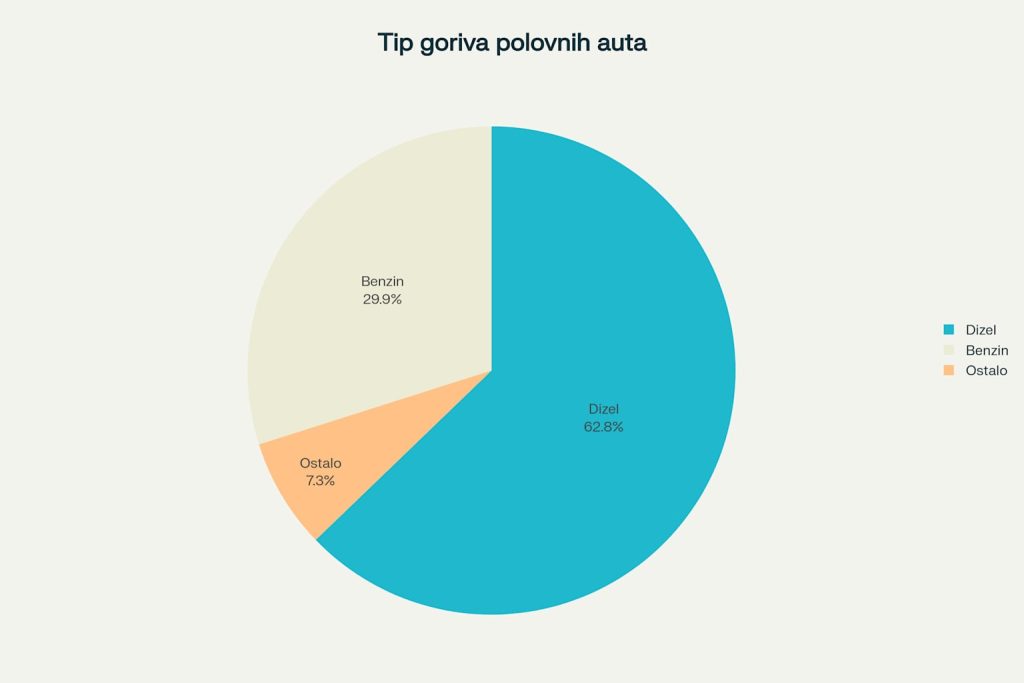 Benzinska vozila zauzimaju tek 29,9% tržišta, dok alternativna goriva (hibridna i električna) čine svega 7,16%. Zanimljivo je da električna vozila učestvuju sa manje od 1% u ukupnoj prodaji polovnjaka.